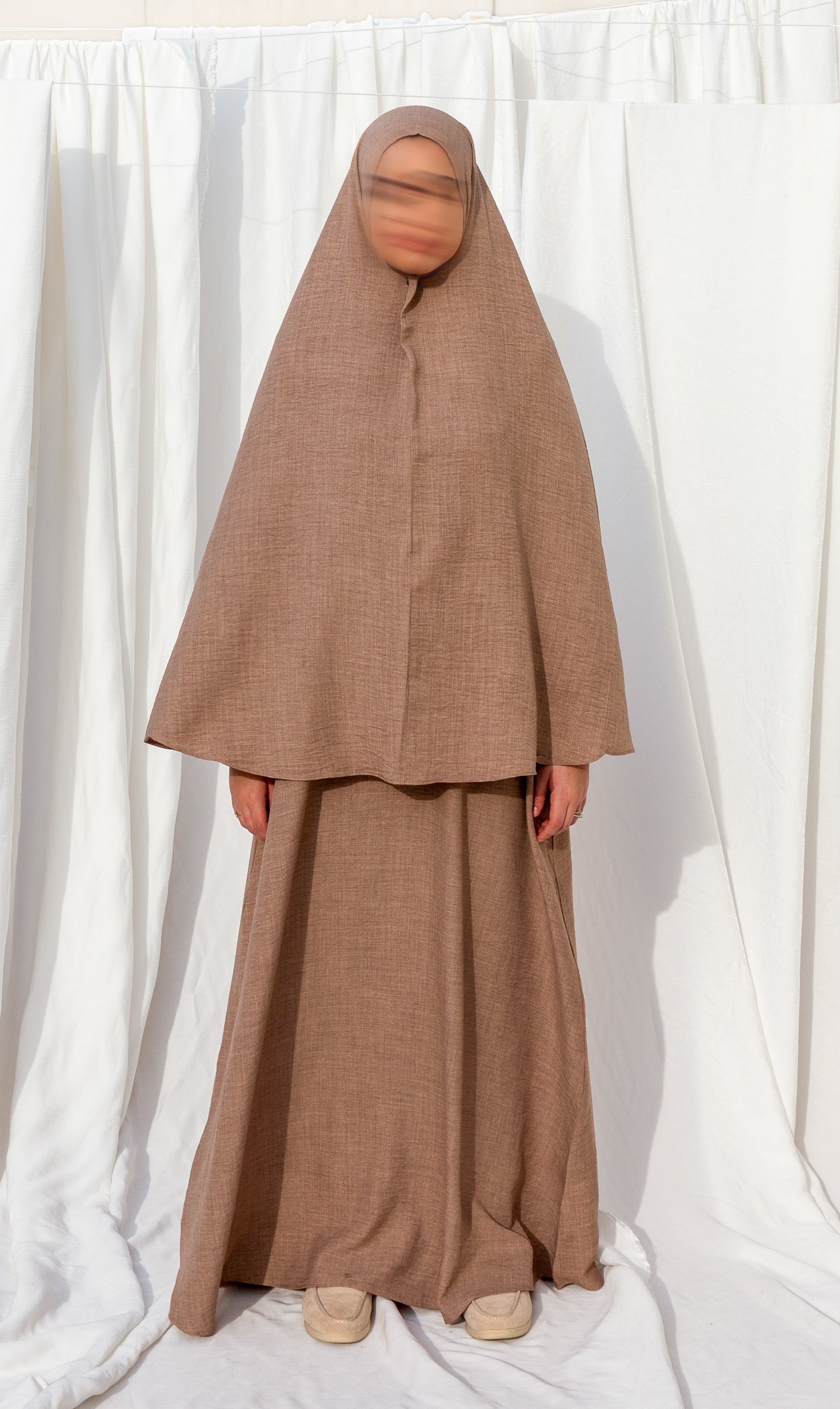 A fine hip khimar made of a linen-look fabric. It's lightweight, comfortable, and has a moderate amount of stretch. The khimar can be matched with the 3baya abaya, which can be ordered separately. The khimar is approximately 110cm long. The fabric is opaque.