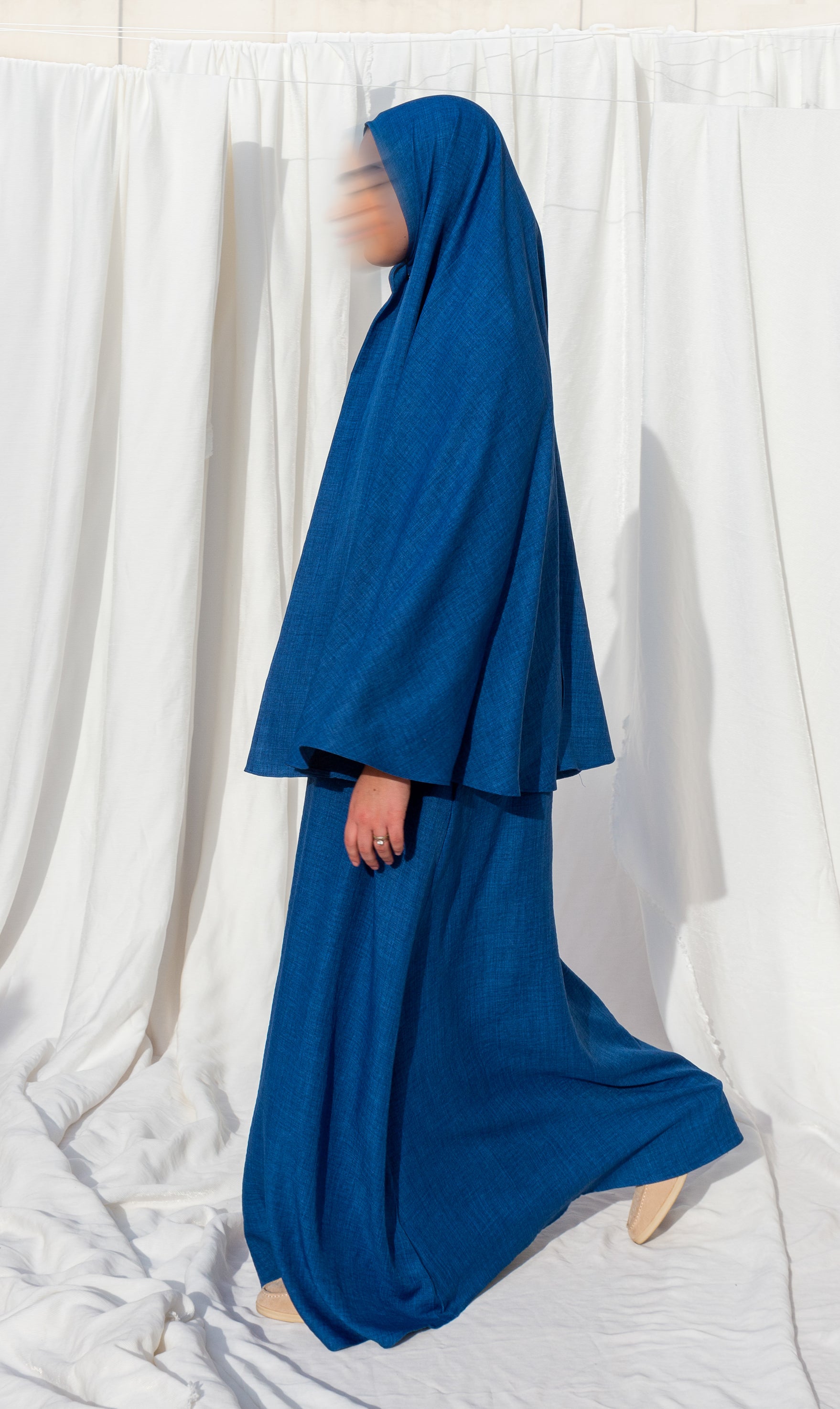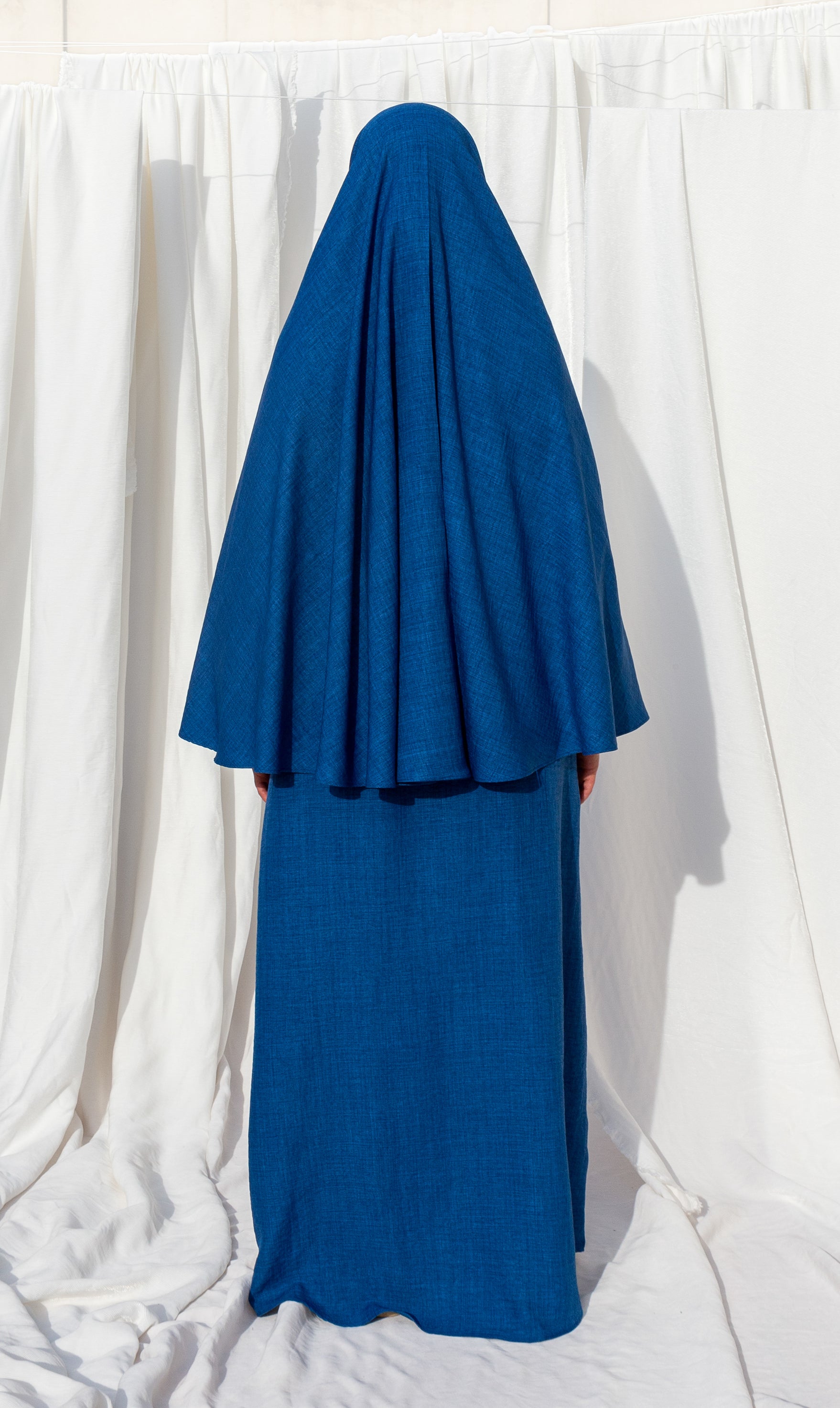 A fine hip khimar made of a linen-look fabric. It's lightweight, comfortable, and has a moderate amount of stretch. The khimar can be matched with the 3baya abaya, which can be ordered separately. The khimar is approximately 110cm long. The fabric is opaque.