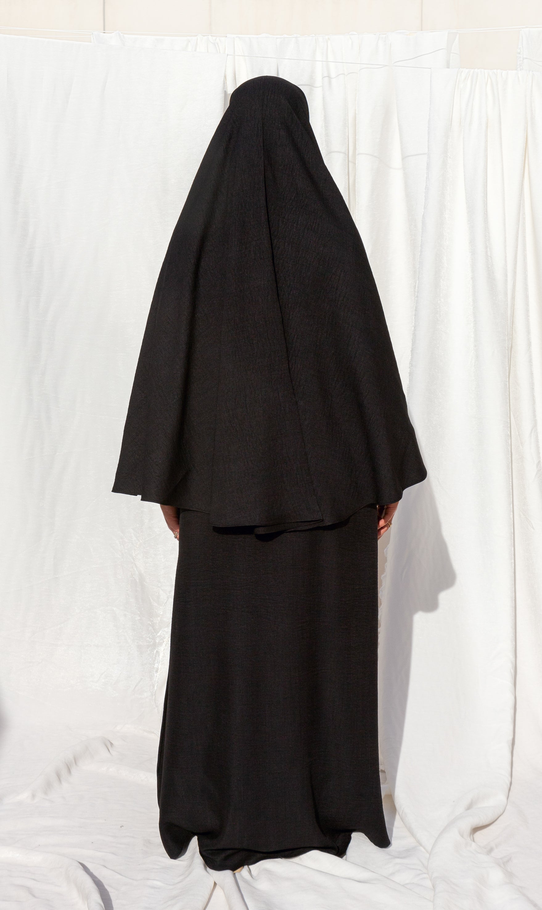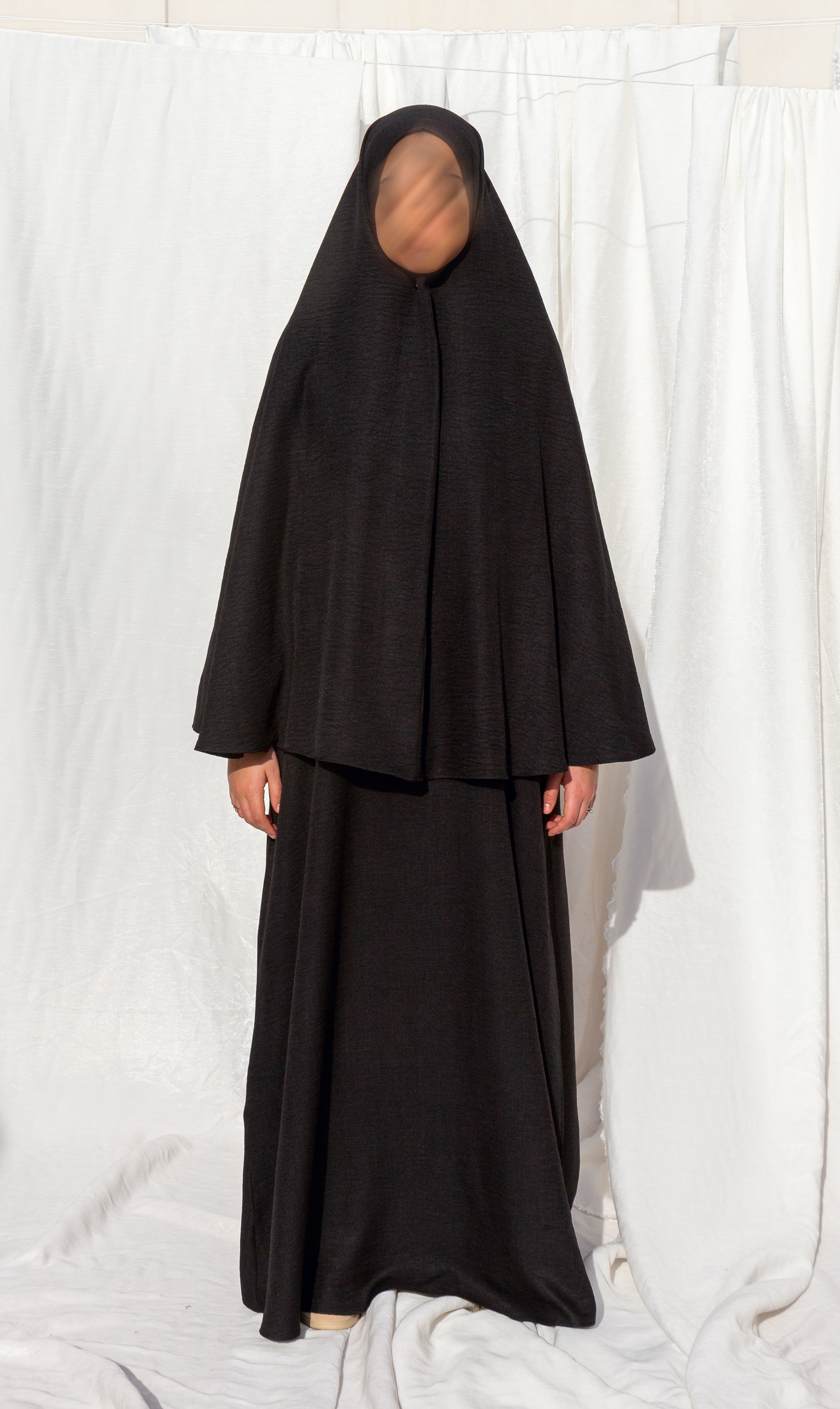 A fine hip khimar made of a linen-look fabric. It's lightweight, comfortable, and has a moderate amount of stretch. The khimar can be matched with the 3baya abaya, which can be ordered separately. The khimar is approximately 110cm long. The fabric is opaque.